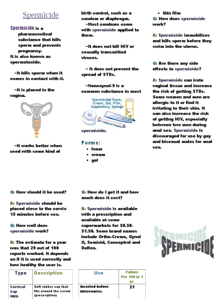 Spermicides can be used alone but are more effective when used with another birth control method such as condoms or a diaphragm. Spermicides are films creams or foams that contain a chemical called Nonoxynol 9 N-9 that is toxic to sperm. How effective is spermicide.